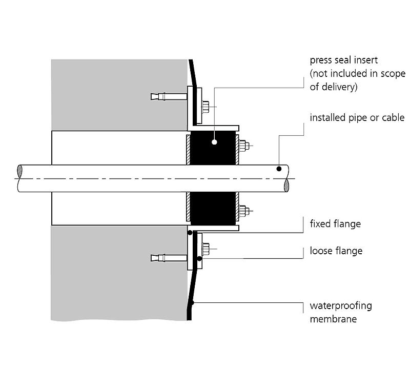 D1: wall sleeve Øi, D2: fixed flange OD, D3: loose flange OD
