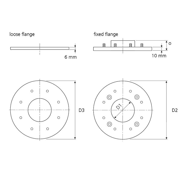 D1: wall sleeve Øi, D2: fixed flange OD, D3: loose flange OD