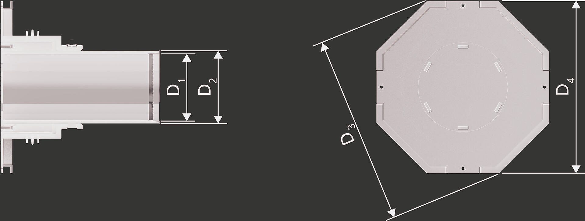D1: wall sleeve Øi, D2: wall sleeve Øa, D3: flange edge dimension, D4: flange surface dimension