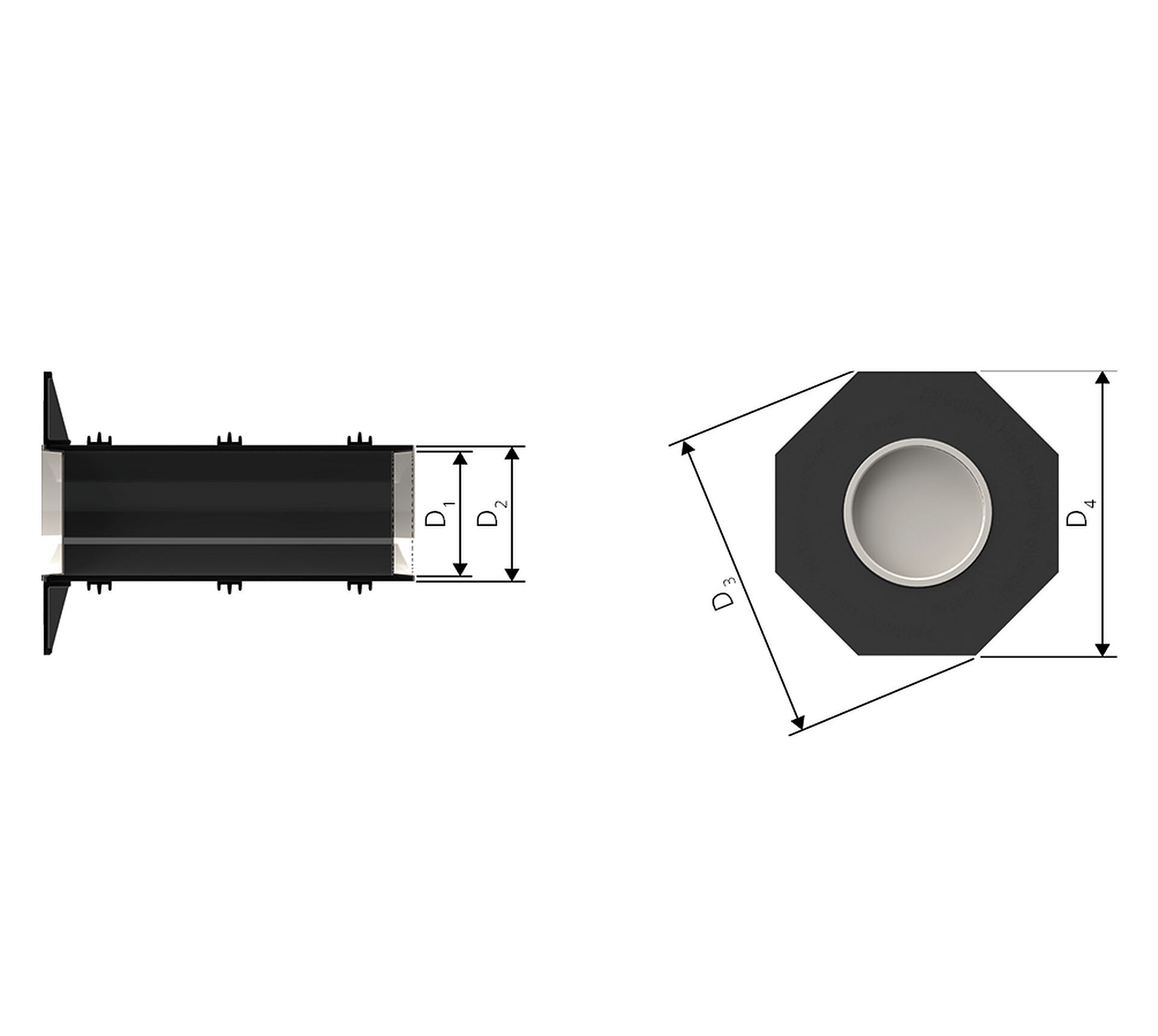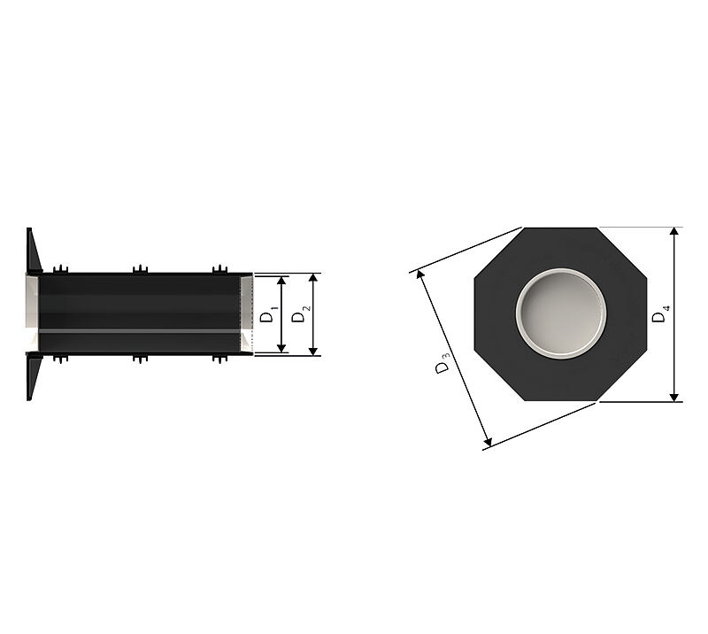 D1: wall sleeve Øi, D2: wall sleeve Øa, D3: flange edge dimension, D4: flange surface dimension